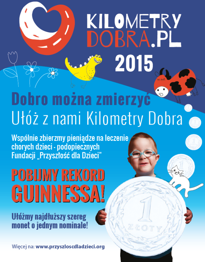 Nasza impreza ma charakter charytatywny. Razem z Fundacją Przyszłość dla dzieci zbieramy podczas wydarzenia pieniądze, które rozmienimy na złotówki. Dlaczego złotówki? Bierzemy wspólnie udział w ogólnopolskiej akcji: „Kilometry dobra”. Dokładnie 44 zł to jeden metr dobra. Z zebranych złotówek układamy szlak i bijemy światowy rekord Guinessa!