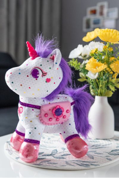 Ta urokliwa, mięciutka maskotka łączy w sobie nowoczesny świat cyfrowy z kreatywną zabawą. Dzięki dołączonym do zestawu akcesoriom (magicznej szczotce do czesania ogonka i grzywy oraz opasce do spania) dziecko może troszczyć się o swojego nowego przyjaciela i przygotowywać go do snu.