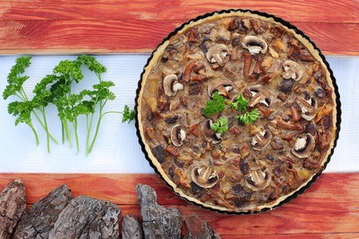 i podsmażyć na maśle. Podgrzybki i kurki oczyścić, zagotować w osolonej wodzie i odcedzić. Do cebuli wkroić oczyszczone pieczarki, dodać grzyby i chwilę podsmażyć. Następnie dodać mąkę, wymieszać, dodać śmietankę, sól, pieprz do smaku. Całość zagotować i wyłożyć na podpieczone ciasto. Tartę upiec w piekarniku w temp. 180°C, aż ładnie się zrumieni. Podawać z sosem pieczarkowym Tarsmak.