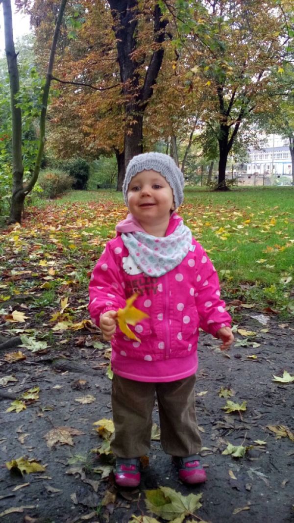 Opis zdjęcia: Martynka lubi jesień za piękne liście, które może zbierać