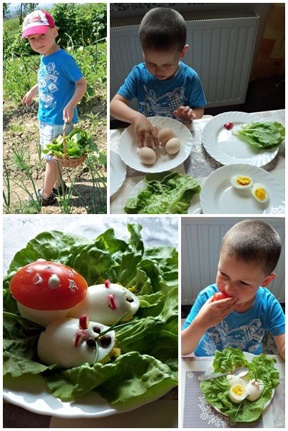 Opis zdjęcia: Warzywa z przydomowego ogródka, bez chemii zbędnej, własnoręcznie przygotowane smakują najlepiej. Danie może nie jest idealnie wykończone, lecz ważne że rękami dziecka przyrządzone. I zjedzone:)