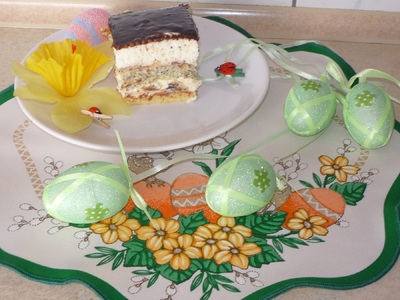 BISZKOPT: białka ubić, dodać do ubitych cukier i nadal ubijać. Do piany dodać żółtka i ubijać na mniejszych obrotach. Mąkę wymieszać z proszkiem do pieczenia i łyżką wmieszać do masy. Przełożyć na wysmarowaną margaryną brytfannę. Piec ok. 25 minut w 180 st.