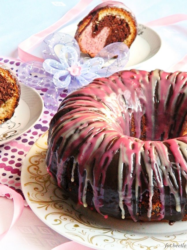 Do formy wysmarowanej masłem i wysypanej bułką tartą wlać kolejno ciasto jasne, ciasto kakaowe i na końcu ciasto różowe.