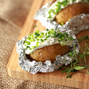 Ziemniaki dokładnie umyć, przekroić na pół i wydrążyć środek. Boczek i cebulę pokroić w drobną kostkę, podsmażyć na patelni, doprawić pieprzem i majerankiem. Do podsmażonego boczku dodać wyciśnięty przez praskę czosnek i całość wymieszać. Wydrążone ziemniaki wypełnić nadzieniem, złożyć razem i dokładnie zawinąć w podwójną folię aluminiową. Piec w żarze do miękkości (około 45 - 50 minut)