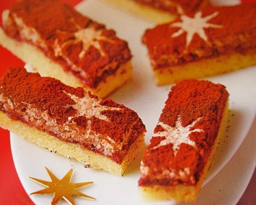 Schłodzone umieścić na blasze wyłożonej papierem do pieczenia, przykryć folią, rozwałkować na wielkość formy. Zdjąć folię, ciasto posmarować konfiturą. Białka ubić na sztywną pianę. Cukier puder wymieszać z migdałami, połączyć z pianą. Wyłożyć na konfiturę. Ciasto wstawić do piekarnika nagrzanego do 180 stopni. Piec 25 minut. Wyjąć na deskę razem z papierem i jeszcze ciepłe pokroić w kawałki. Zostawić do wystygnięcia. Na każdym ciasteczku ułożyć szablon gwiazdki, posypać kakao przez sitko, zdjąć szablon.